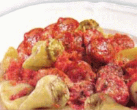 Σε μία κατσαρόλα βάζουμε μία στρώση λουκάνικα, μία στρώση πιπεριές και από πάνω pummaro να καλύπτει την επιφάνεια.